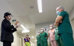 Executada de forma lúdica e silenciosa, a fim de prender a atenção do colaborador e de quem passava pelos setores, a ação levou o ator por diversas unidades do hospital. Na ocasião, o artista mostrou placas com depoimentos colhidos nas pesquisas. Em seguida, as equipes indicaram alternativas para evitar ruídos. Dentre elas, o uso de fones de ouvido, de aparelhos no modo silencioso e de TVs em volume baixo.