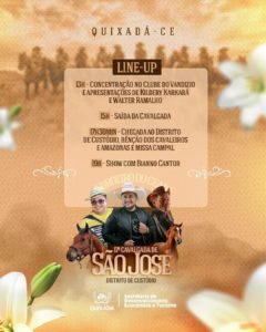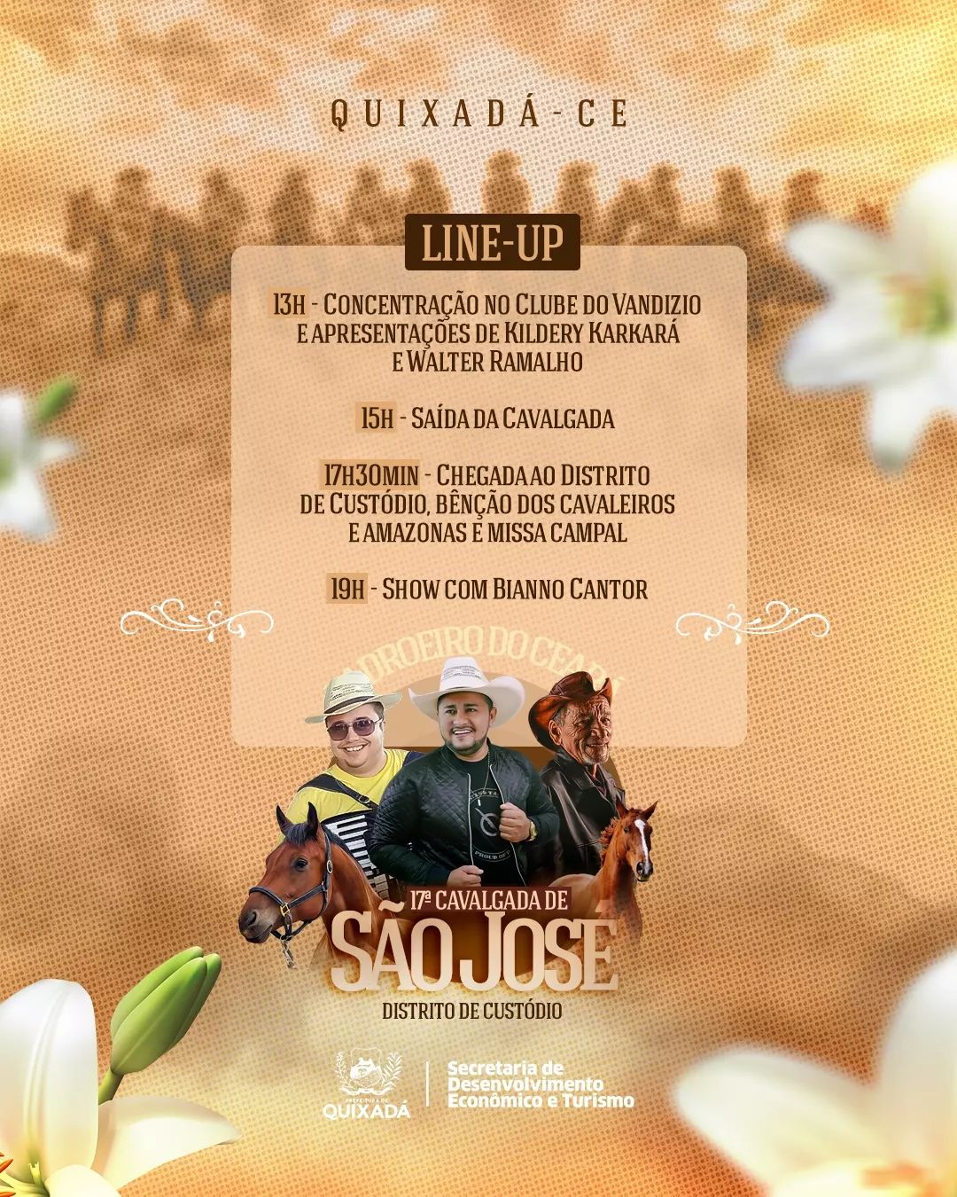 A previsão de chegada no distrito de Custódio é as 17h. A noite também terá um show com Biano Cantor, músico conhecido por seu forró de vaquejada, encerrando o evento.
