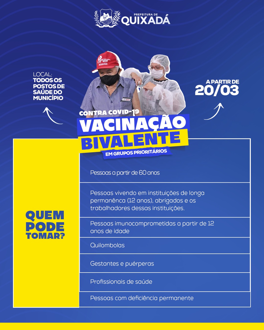 O município de Quixadá ampliou nesta segunda-feira (20) a aplicação da vacina bivalente contra a COVID-19 para todos os grupos prioritários. A aplicação do imunizante é feita em todos os postos de saúde do município de segunda a quinta-feira, sempre de 8h às 11h e de 13h às 16h, e as sextas-feiras de 7h às 13h.