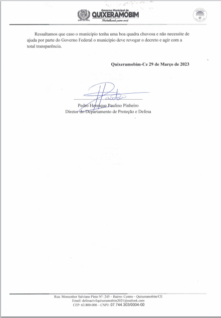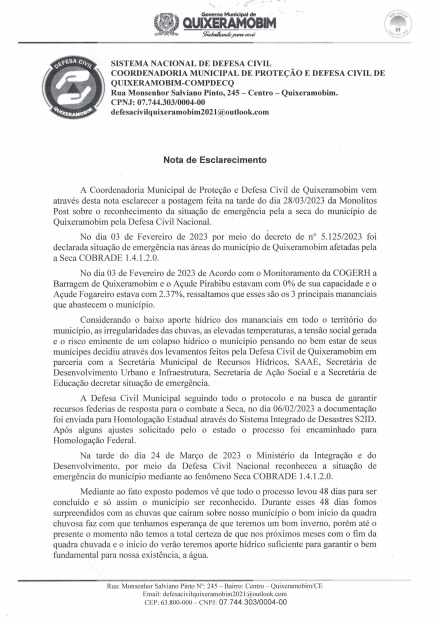 Em nota, a Defesa Civil de Quixeramobim afirmou que o decreto de situação de emergência foi enviado no dia 06 de fevereiro de 2023, em virtude do baixo aporte hídrico da Barragem de Quixeramobim, Açude Fogareiro e Açude Pirabibu, os três principais mananciais que abastecem o município, estarem com seu volume próximo de 0%.