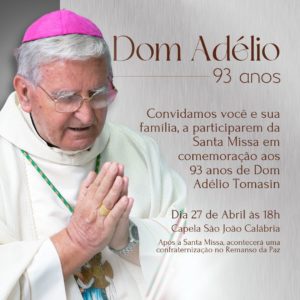 Para celebrar essa tão importante data, será celebrada uma missa em Ação de Graças pela vida de Dom Adélio na Capela São João Calábria, a partir das 18h, e logo em seguida uma confraternização no Remanso da Paz.