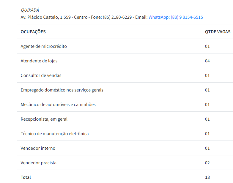 Confira abaixo a relação das vagas de emprego disponíveis para Quixadá.