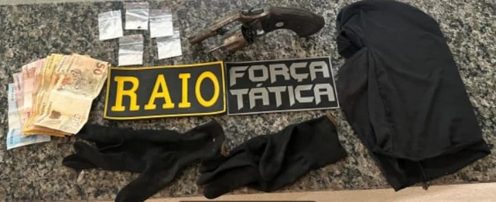 A composição do CPRAIO solicitou reforço policial da Força Tática da 3ª Companhia do 9º Batalhão Policial Militar (3ª Cia/ 9º BPM) e foram até o local averiguar as denúncias. Chegando ao endereço, os policiais militares visualizaram vários homens se evadindo para uma zona de mata, sendo capturado João Victor Monteiro Nobre, 19, de posse de 4,4 gramas de cocaína em papelotes e dinheiro. O suspeito também entregou um revólver calibre .38 que estava escondido. Em verificação ao sistema policial, foi constatado um mandado de prisão em aberto em desfavor de João Victor por um crime de homicídio doloso em março do corrente ano.