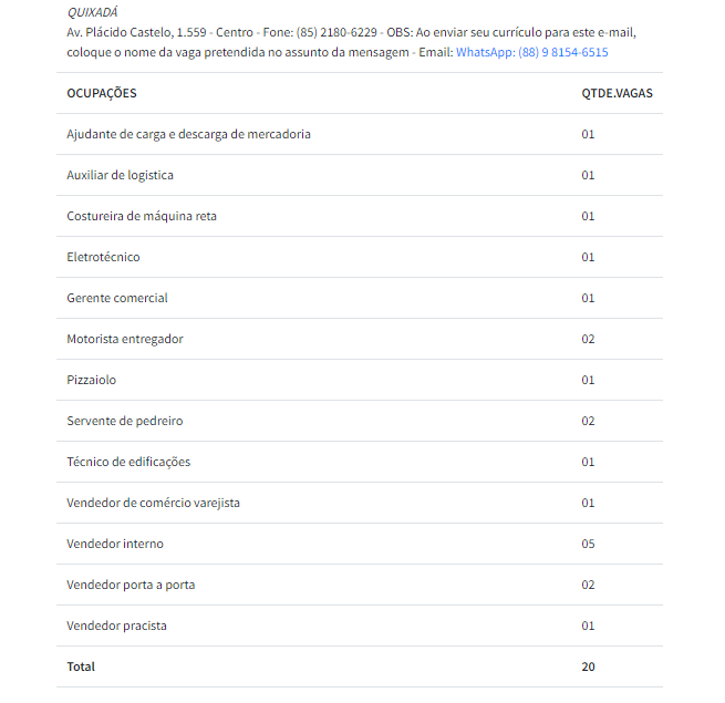 Confira abaixo a relação das vagas de emprego disponíveis para Quixadá.
