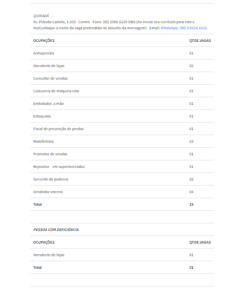 Para maiores informações os interessados deverão entrar em contato com o Sine/IDT por meio dos telefones (85) 2180-6229 ou (88) 98154-6515 (whatsapp).