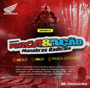 A cidade de Quixadá volta a receber nesta quinta-feira (05) a partir das 19h30min um show de manobras radicais e acrobacias com a Equipe Força e Ação. A apresentação marcada para acontecer na avenida Plácido Castelo, em frente a Praça José de Barros, deverá reunir um grande público. O evento é realizado pela empresa Motocedro e conta com apoio da Prefeitura de Quixadá.