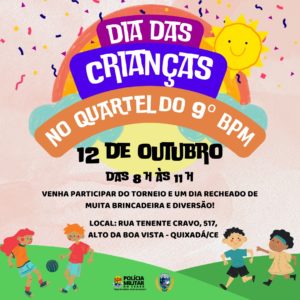 O Quartel do 9º Batalhão da Polícia Militar sediado em Quixadá, tendo a frente o Comandante George Vidal, promove nessa quinta-feira (12), das 8h às 11h, o Projeto Dia das Crianças na PMCE – Quartel de Portas Abertas. A iniciativa visa promover uma manhã de muita diversão e alegria e aproximar cada vez mais a sociedade das ações sociais promovidas pela Polícia Militar.