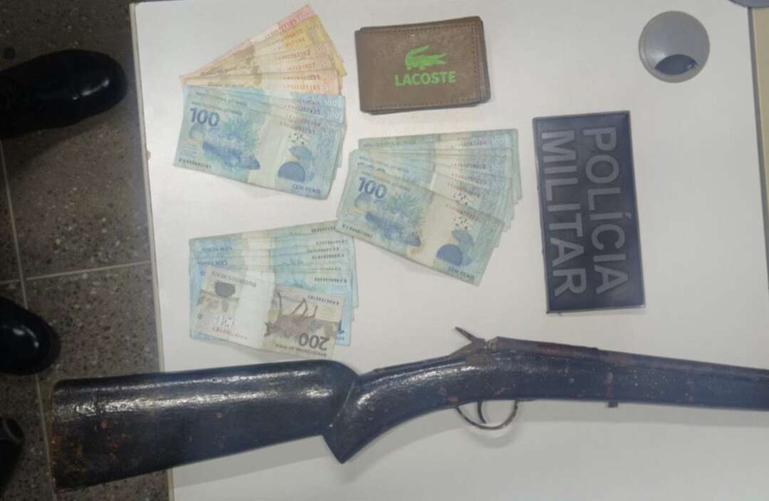 Chegando ao bairro Arraial, visualizaram uma pessoa que, ao perceber a aproximação da equipe, invadiu uma residência, deixando a porta aberta. Dentro do imóvel, localizaram Elinildo, em posse de uma espingarda do tipo socadeira e a quantia de R$ 2.900,00.