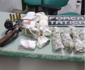 A apreensão do material foi realizada pelos militares do 4° Batalhão Policial Militar, depois que foram acionados por populares para checar um possível esconderijo em que estariam guardadas droga e arma de fogo.