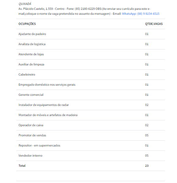 O Sine/IDT está com 23 vagas de emprego abertas para o município de Quixadá. Aqueles pessoas que desejam uma oportunidade de entrar no mercado de trabalho, deverão procurar a unidade do Sine/IDT que na Terra dos Monólitos fica localizada no piso superior do terminal rodoviário.