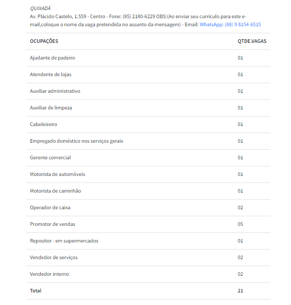 Entre as vagas abertas, destaca-se as funções de ajudante de pedreiro, atendente de lojas, auxiliar administrativo, auxiliar de limpeza, entre outros. Mas também estão disponíveis oportunidades para diversas funções como gerente comercial, operador de caixa, vendedor interno, e mais.
