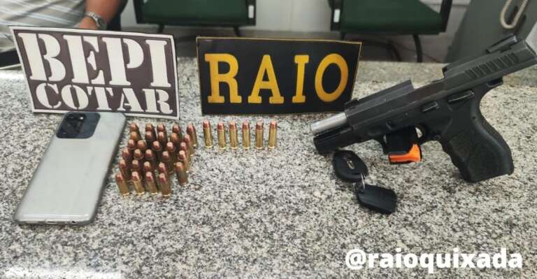 A equipe solicitou apoio, e a patrulha do COTAR realizou um cerco, localizando os suspeitos que tentaram fugir. Com o trio foi encontrada uma pistola calibre .40 com a numeração raspada com 12 munições. Os indivíduos foram conduzidos à Delegacia Regional de Quixadá, onde foram feitos procedimento por porte ilegal de arma de fogo, além do cumprimento de mandado de prisão, de acordo com os artigos 16, §1°, IV e 14 da lei 10.826.