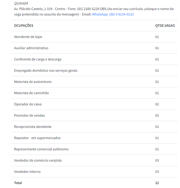 Entre as vagas abertas, destaca-se as funções de atendente de loja, auxiliar administrativo, motorista, entre outros. Mas também estão disponíveis oportunidades para diversas funções como operador de caixa, promotor de vendas, e mais.