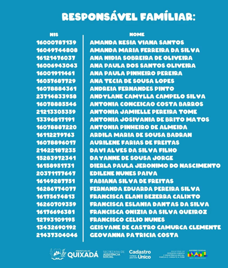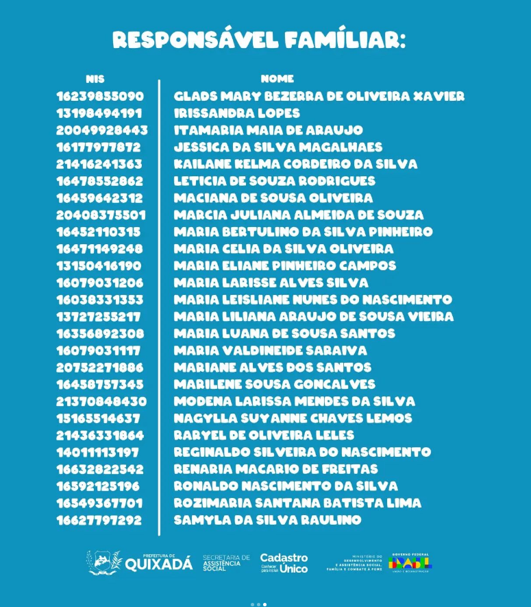 Confira abaixo os nomes dos beneficiados de dezembro do Programa Bolsa Família em Quixadá.