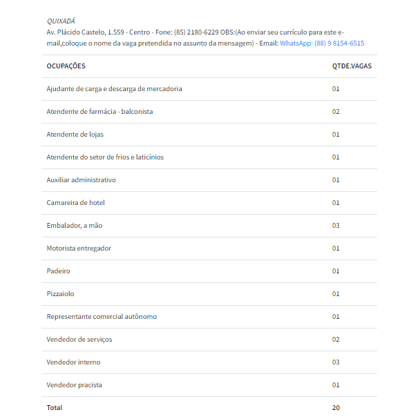 Entre as vagas abertas, destaca-se as funções de ajudante de carga e descarga, atendente de farmácia, atendente de loja, entre outros. Mas também estão disponíveis oportunidades para diversas funções como auxiliar administrativo camareira de hotel, e mais.