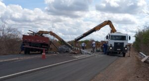 O acidente ocorreu por volta das 11h40, no km 215, localidade de Juazeiro, em Boa Viagem, quando um caminhão tombou após o pneu estourar. O veículo, que transportava postes e transformadores tombou e derramou óleo diesel no asfalto. O condutor, que não teve a identidade revelada, saiu ileso.