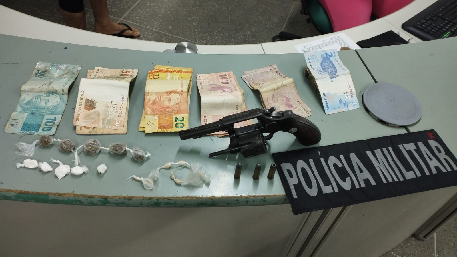 A Polícia Militar do Ceará (PMCE), por meio de equipe da 2ª Companhia do 4º Batalhão (2ª Cia/ 4º BPM), apreendeu um revólver calibre .32 com três munições intactas, cocaína, crack, maconha e 511 reais em dinheiro. O material estava dentro de uma bolsa ao lado de uma residência na cidade de Itatira.