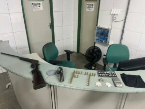 Na madrugada desta quarta-feira (3), uma equipe da Força Tática (FT) da 3ª Companhia do 4º Batalhão da Polícia Militar do Ceará (PMCE), em Aratuba, apreendeu uma espingarda de calibre .36, um revólver .38, 24 munições .38, 20 trouxinhas de crack, 11 de cocaína e quatro de maconha. Um suspeito foi preso durante a ocorrência.