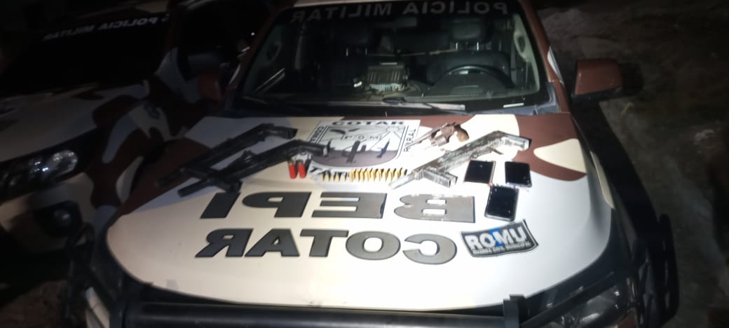 Equipes da 2ª Companhia do 9º Batalhão Policial Militar (2ª Cia/ 9º BPM) e do Comando Tático Rural (Cotar) realizaram um cerco na residência e capturaram cinco indivíduos armados. Foram apreendidas na ocorrência três escopetas calibre .12 artesanais e um revólver calibre .32, cinco munições de calibre .32 intactas, 19 munições de calibre .38 intactas, duas munições de calibre .12 intactas, quatro smartphones.