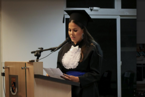 Com uma fala bastante emocionada, a oradora docente Tânia Pinheiro exaltou a vitória pessoal de cada estudante que colava grau naquela noite. “A festa de hoje é por terem entendido que são capazes de fazer o que escolheram fazer e o que escolheram ser. Com o tempo consegui entender que o que sentimos vai muito além da sensação de dever cumprido, mas a emoção por ter participado da realização do sonho de filhos e filhas do meu coração. Quando olhamos e pensamos, ‘eles venceram!’ é a parte mais valiosa”, considerou.
