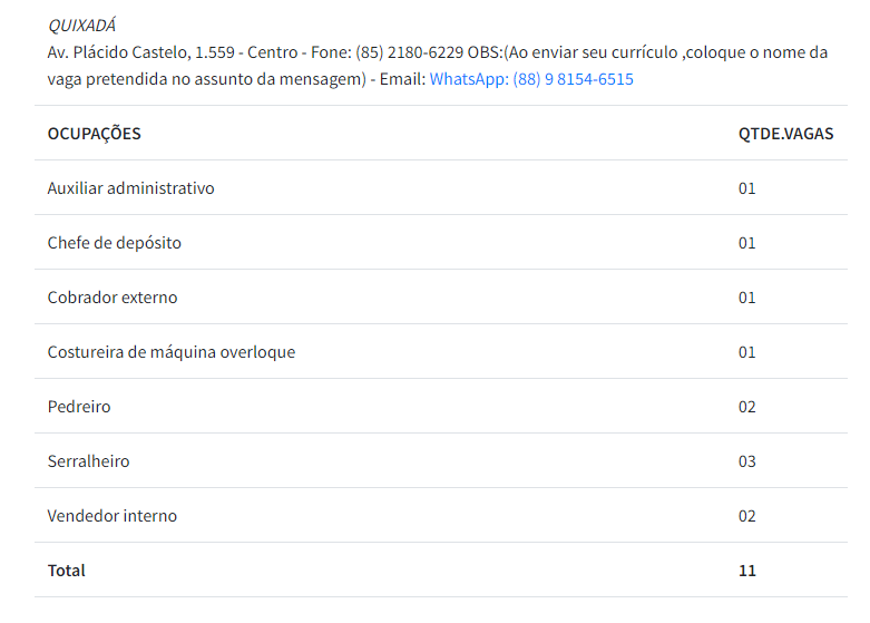 Entre as vagas abertas, destaca-se as funções de auxiliar administrativo, chefe de depósito, cobrador externo, entre outros. Mas também estão disponíveis oportunidades para diversas funções como pedreiro, serralheiro e mais.