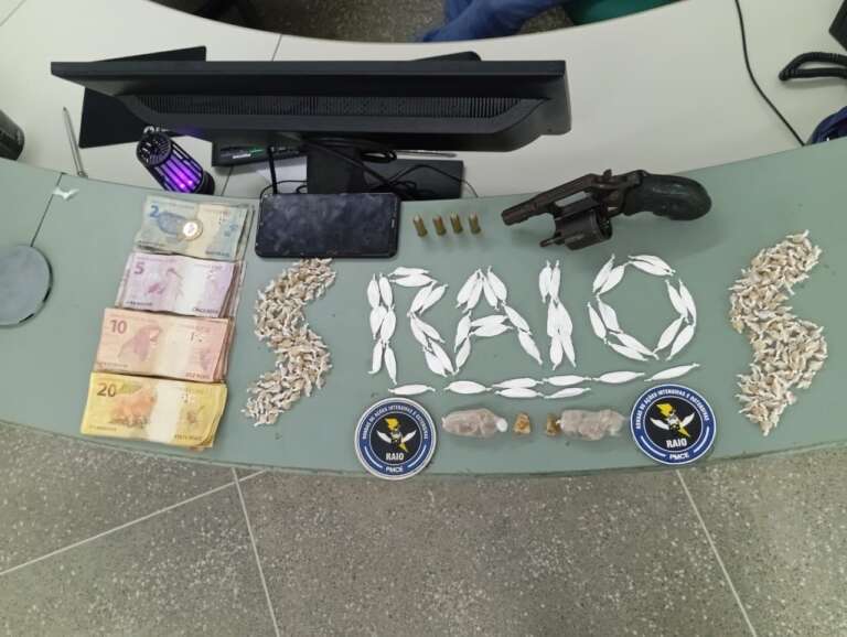 O Centro de Operações da Polícia Militar (Copom) acionou uma equipe do Comando de Policiamento de Rondas de Ações Intensivas e Ostensivas (CPRAIO), para averiguar uma situação de tráfico de drogas no bairro Padre Paulo. A equipe, ao chegar ao endereço, visualizou um homem tentando se desfazer do material. Ao ser detido, o suspeito, que tem passagem por tráfico de drogas e associação para o tráfico, informou aos agentes que, além dos 286 papelotes de drogas (entre cocaína e crack) e a quantia de R$286 em espécie, também mantinha uma arma de fogo consigo. Ele entregou um revólver calibre .38 com quatro munições. Preso em flagrante, o suspeito foi conduzido à Delegacia Regional do Canindé, para realização do procedimento legal.