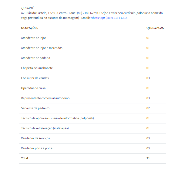 Confira abaixo a relação completa das vagas ofertadas para Quixadá.