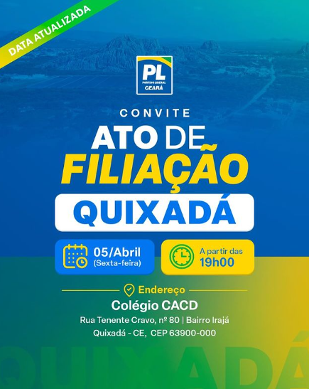 O PL deverá ser mais um partido que deverá fazer parte do ciclo de alianças que junto ao PSB e o PSD, além de outros partidos ainda em articulação, que irão apoiar a pré-candidatura a reeleição do atual Prefeito de Quixadá, Ricardo Silveira. A oficialização do apoio deverá ocorrer durante o encontro dessa sexta-feira (05).