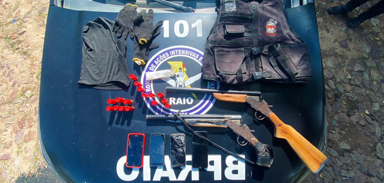 A Polícia Militar do Ceará (PMCE) apreendeu, por volta de 13h40 da última sexta-feira (5), duas espingardas, um colete balístico, munições e cocaína na cidade de Baturité. Suspeitos atiraram contra os policiais militares e se evadiram.