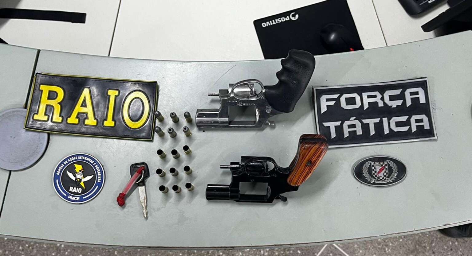 Com as buscas, os militares localizaram a motocicleta abandonada e capturaram os dois suspeitos – um homem, de 22 anos, que já possui antecedentes criminais por roubo de veículo e receptação; e um adolescente, de 17 anos, que já possui registro de ato infracional análogo ao crime de tráfico ilícito de drogas. Os militares apreenderam, com eles, dois revólveres calibre 38 com 16 munições de mesmo calibre – sendo 10 deflagradas e seis intactas -, uma balaclava e a motocicleta em que os suspeitos estavam. Ainda durante os trabalhos, os policiais identificaram que a dupla seria integrante de um grupo criminoso atuante na região.