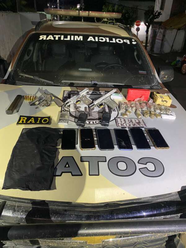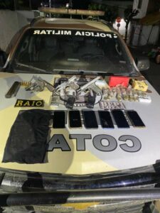 A Polícia Militar do Ceará (PMCE) apreendeu uma granada, duas pistolas cal. 9mm e .380, um revólver cal. 38, 43 munições, quatro motociclistas, dois rádios comunicadores, além de 840g de maconha, 40g de cocaína, dinheiro em espécie e cinco aparelhos celulares, em uma ocorrência, iniciada na noite dessa quinta-feira (27), em Boa Viagem. Na ocasião, dois suspeitos morreram após confronto com os agentes.