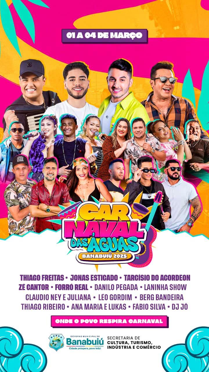 14 atrações vão passar por Thiago Banabuiú na edição do Carnaval das Águas 2025. Entre as principais, estão Thiago Freitas, Jonas Esticado e Tarcísio do Acordeom. Os nomes foram confirmados pelo prefeito Marcílio Coelho, durante uma live nas suas redes sociais.
