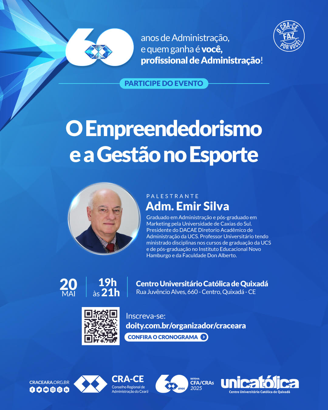 No próximo dia 20 de maio, às 19h, o Auditório Dom Hélder, na UniCatólica, será palco de uma palestra imperdível sobre empreendedorismo e gestão no esporte, ministrada pelo Administrador Emir Silva, referência nacional em administração esportiva. O evento, promovido pelo Conselho Regional de Administração (CRA), é aberto ao público e voltado especialmente para estudantes e profissionais da Administração e da Educação Física, fortalecendo o diálogo entre áreas que vêm ganhando destaque no cenário da inovação e da gestão estratégica no Brasil.