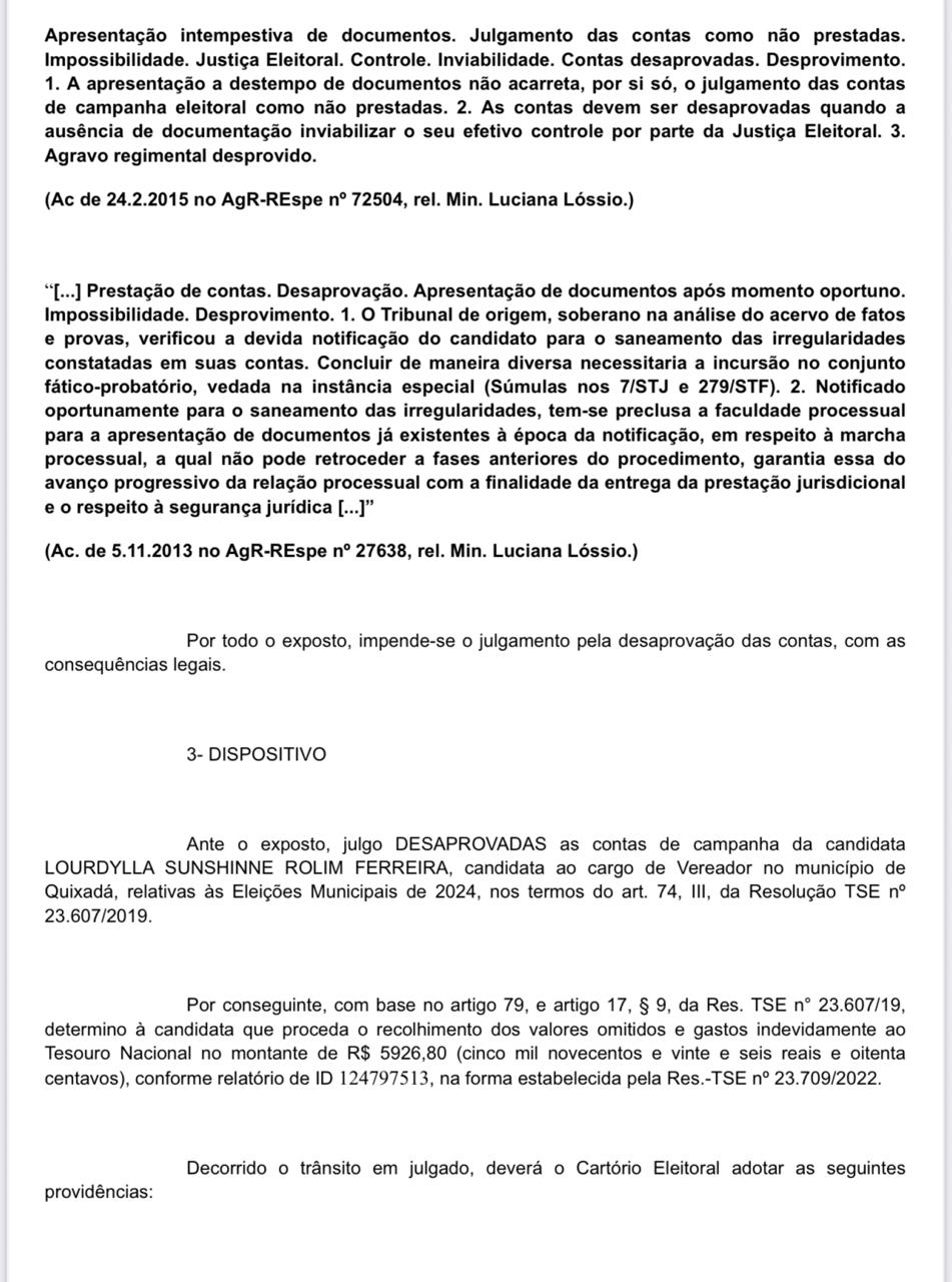 A Justiça Eleitoral desaprovou as contas de campanha da candidata Lourdylla Sunshinne, que disputou o cargo de vereadora nas Eleições Municipais de 2024, em Quixadá pelo Partido dos Trabalhadores – PT e que ficou conhecida no município como a Vereadora do “Tigrinho” devido a divulgação de plataformas de jogos de azar como o “Jogo do Tigrinho”, que é prática considerada ilegal no país. A decisão foi tomada após análise técnica que identificou diversas irregularidades nas finanças da campanha, consideradas graves e não corrigidas, mesmo após diligências realizadas. O julgamento foi conduzido pelo juiz Welithon Alves de Mesquita, da 6ª Zona Eleitoral.