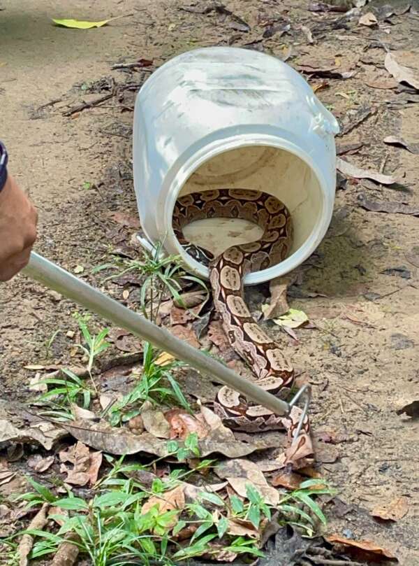 A jiboia foi resgatada, passou por uma avaliação e foi solta em um habitat natural adequado para a sua espécie e distante das residências.