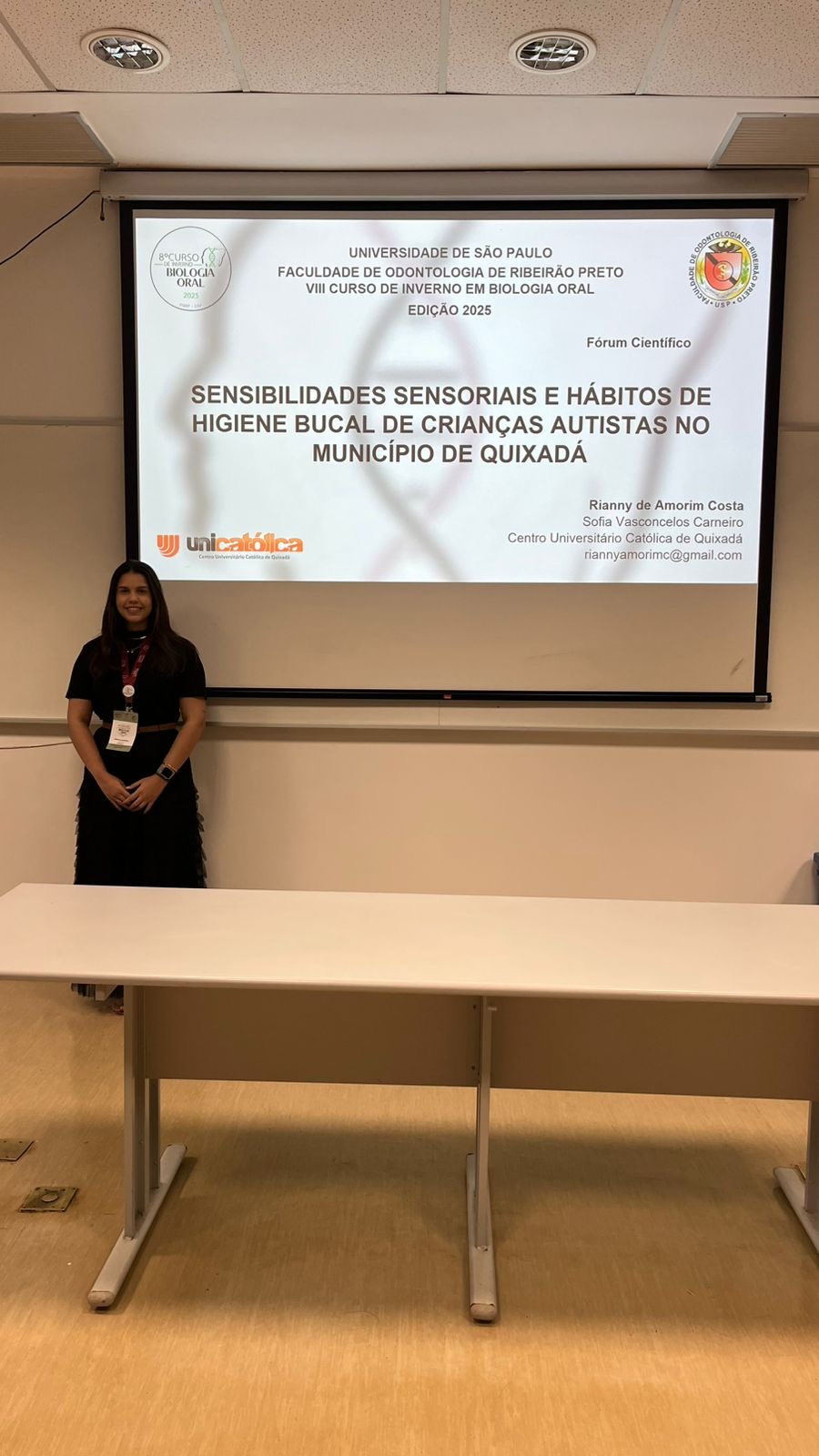 Entre os dias 21 e 25 de julho, a acadêmica Rianny Amorim, do 8º semestre de Odontologia, esteve na Faculdade de Odontologia de Ribeirão Preto da Universidade de São Paulo (FORP – USP) para participar do VIII Curso de Biologia Oral. Além de acompanhar atividades científicas do programa de Pós-Graduação em Biologia Oral, Rianny apresentou, no Fórum Científico do curso, o trabalho desenvolvido por meio do Programa de Iniciação Científica da UniCatólica (PIC), intitulado: “Sensibilidades Sensoriais e Hábitos de Higiene Bucal de Pacientes Autistas do Município de Quixadá – Ceará”, sob orientação da professora Sofia Vasconcelos.