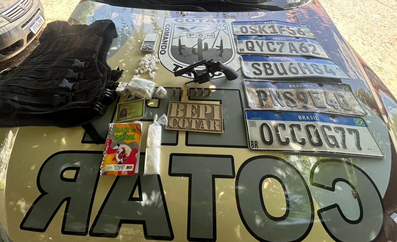 No imóvel, foi encontrado um revólver calibre .38 com seis munições, maconha (157 gramas), cocaína (30 gramas), balança de precisão, capa de colete e cinco placas veiculares possivelmente oriundas de veículos clonados ou roubados. Diante do flagrante, a suspeita recebeu voz de prisão.