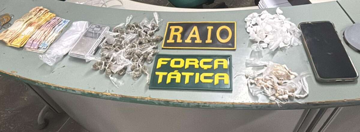 Dentro do material apreendido foram encontradas 64 trouxas de maconha (49g), 48 trouxas de cocaína (43g), 47 trouxas de crack (9g), um aparelho celular e R$ 385,50 em espécie.