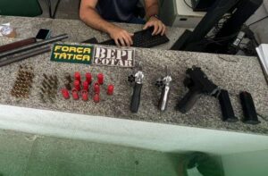 No acampamento, os policiais apreenderam uma pistola calibre .380, dois revólveres calibre .38, duas espingardas calibre 12, além de 103 munições de diversos calibres e duas placas balísticas.