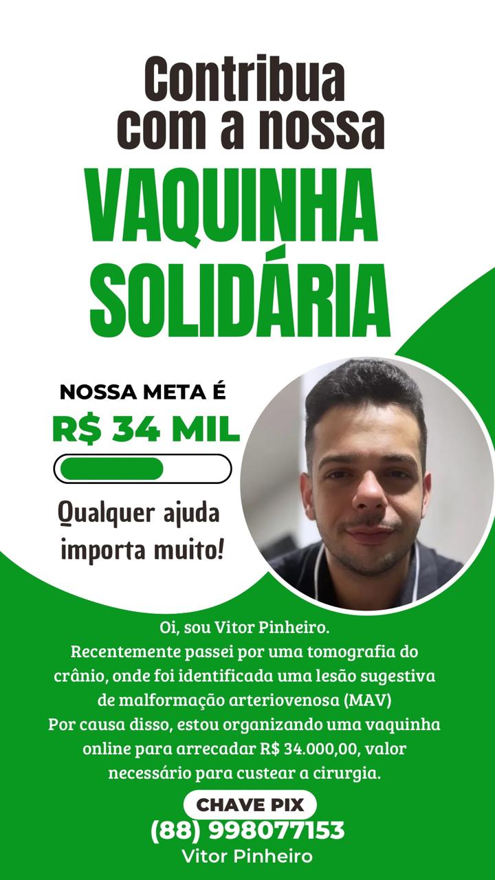 Quem puder ajudar na vaquinha poderá doar valor através da chave pix 88998077153 – Vitor Pinheiro. Qualquer valor doado será muito bem-vindo a ajudará a salvar a vida do jovem Vitor Pinheiro.