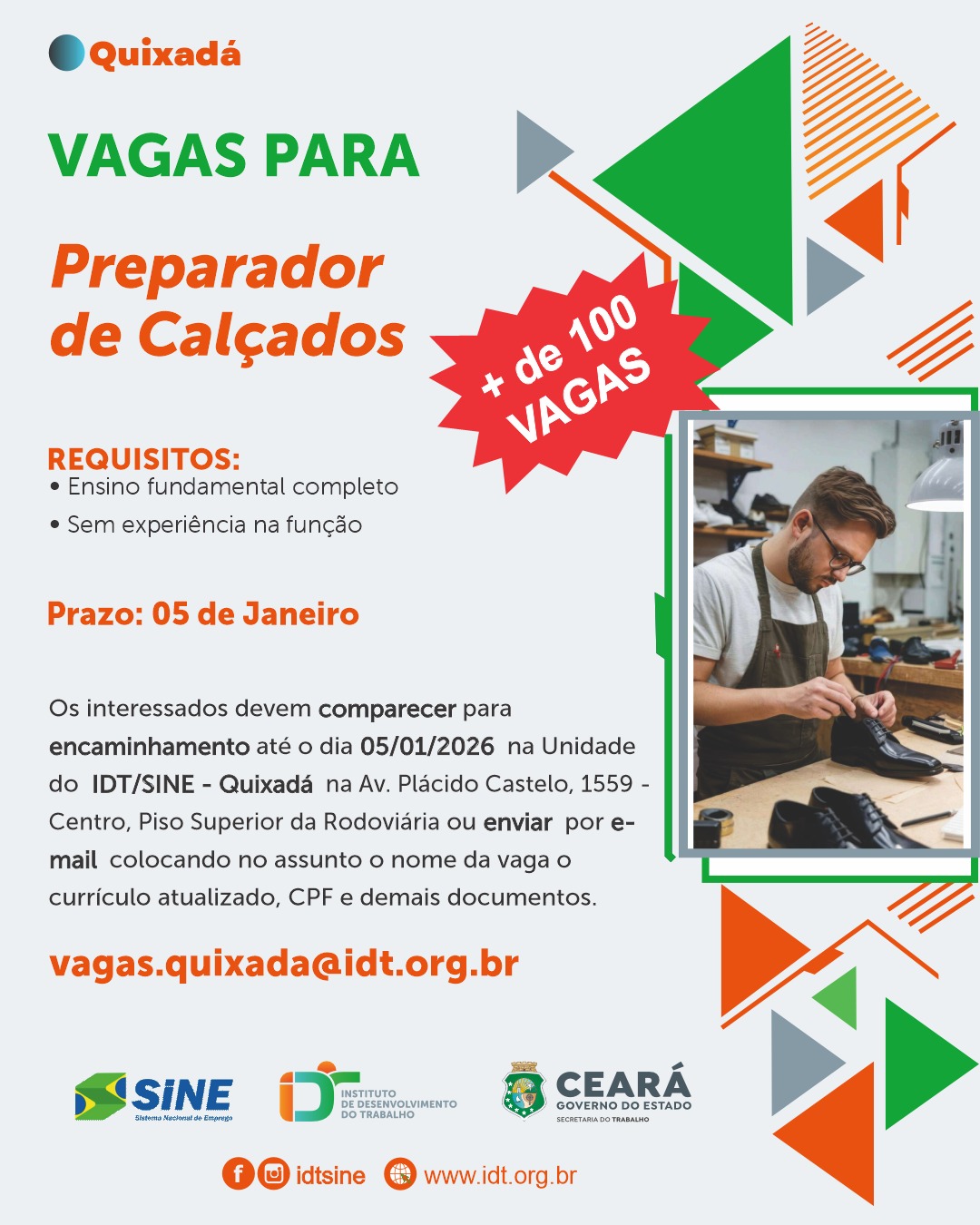 Os interessados deverão comparecer na unidade do Sine/IDT de Quixadá, no piso superior do terminal rodoviário, até o dia 05 de janeiro, ou enviar o currículo atualizado para o email vagas.quixada@idt.org.br e no assunto colocar o nome da vaga disponível.