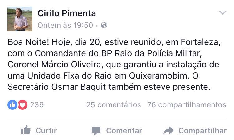 O prefeito de Quixeramobim, Cirilo Pimenta, revelou nesta última quarta-feira (20), numa rede social, que está articulando, junto com o Deputado Osmar Baquit, a instalação fixa do BPRaio naquele município. Segundo Cirilo, houve uma reunião em Fortaleza com o coronel Márcio Oliveira, comandante do Raio, na qual ele e o Deputado Osmar solicitaram a instalação […]