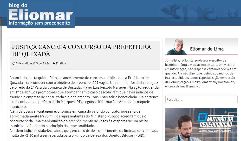 O prefeito de Quixadá, Ilário Marques (PT), disse, ao conceder uma entrevista, que durante as suas gestões nunca houve qualquer tipo de irregularidade em relação a realização de um concurso público. Acontece que o gestor “esqueceu” que no ano de 2008 já teve um concurso anulado pela justiça por, segundo o Ministério Público, haver indícios […]