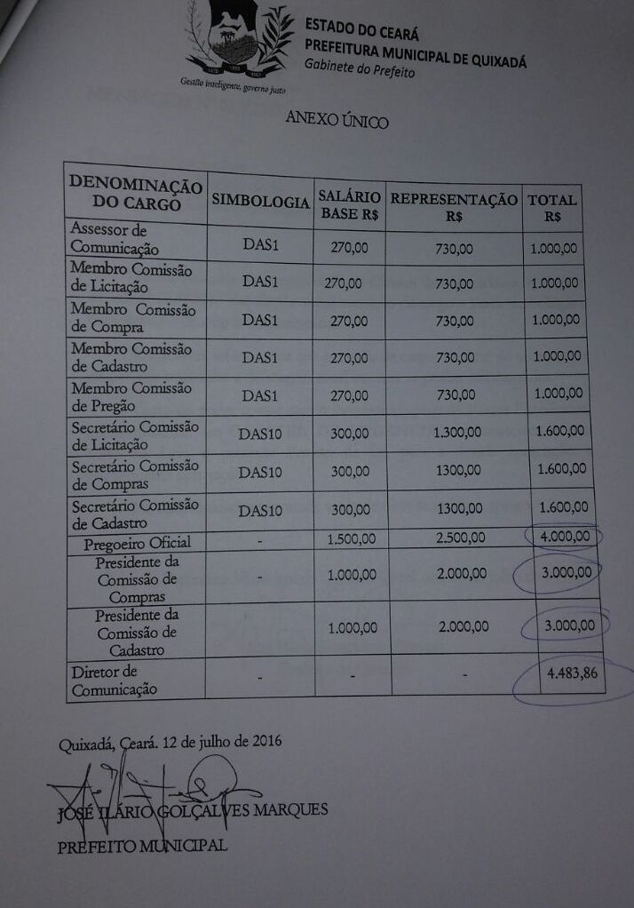 No dia 04 de novembro de 2.016 a Câmara Municipal de Quixadá aprovou um projeto de lei em que aumentava os salários do Prefeito, Vice-prefeito e Secretários municipais. De acordo com o projeto, o salário de Ilário Marques (PT) seria elevado dos atuais R$ 14.663,25 para quase R$ 20 mil, mais especificamente, para R$ 19.355,50. […]
