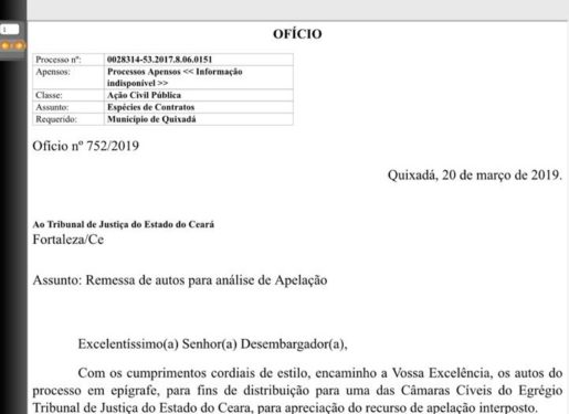 Mais um documento, agora, enviado de uma instância para outra, comprova que o prefeito de Quixadá, Ilário Marques (PT), quer a qualquer custo anular o concurso público, desmentindo assim, uma nota de esclarecimento da administração petista local. O juiz da 3ª vara da comarca de Quixadá, Adriano Ribeiro Furtado, enviou, nessa quarta-feira (20), ofício ao […]