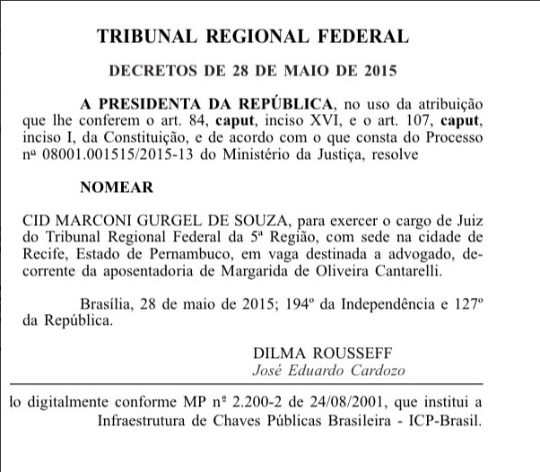 O advogado cearense Cid Marconi passa a ocupar a vaga destinada ao Quinto Constitucional e em razão da aposentadoria da Desembargadora federal Margarida Cantarelli. Cid, estava como juiz eleitora, junto ao TRE do Estado do Ceará, e agora ocupa a vaga para Desembargador federal do Tribunal Regional Federal – 5ª Região, sediado em Recife.