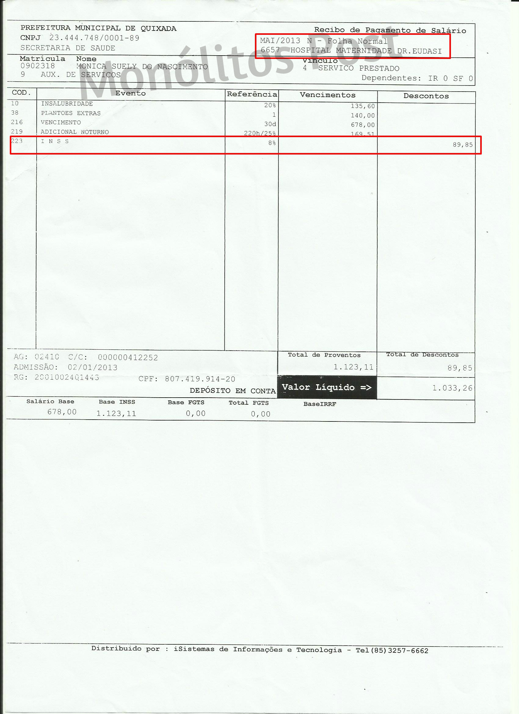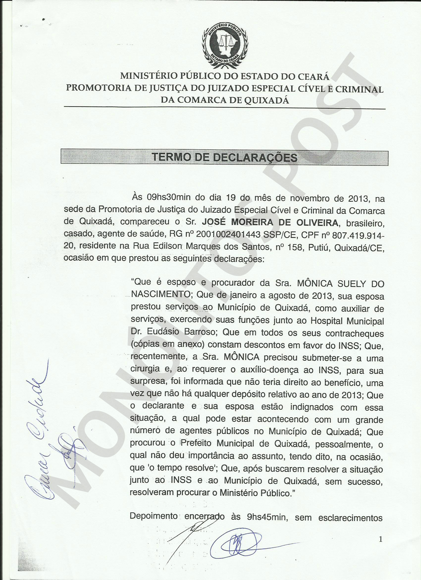 O denunciante foi ouvido pelo Promotor de Justiça, Dr. André Clarck Nunes Cavalcante. Ele informou ao representante do Ministério Público que sua esposa, Sra. Mônica Suely do Nascimento, 46 anos, “prestou serviços ao município de Quixadá, como Auxiliar de Serviços, exercendo suas funções junto ao Hospital Municipal Dr. Eudásio Barroso”. Concordemente, no corpo do Termo de Declarações, Dr. André Clarck afirma ter anexado cópias dos contracheques recebidos pela prestadora no decorrer de 2013.