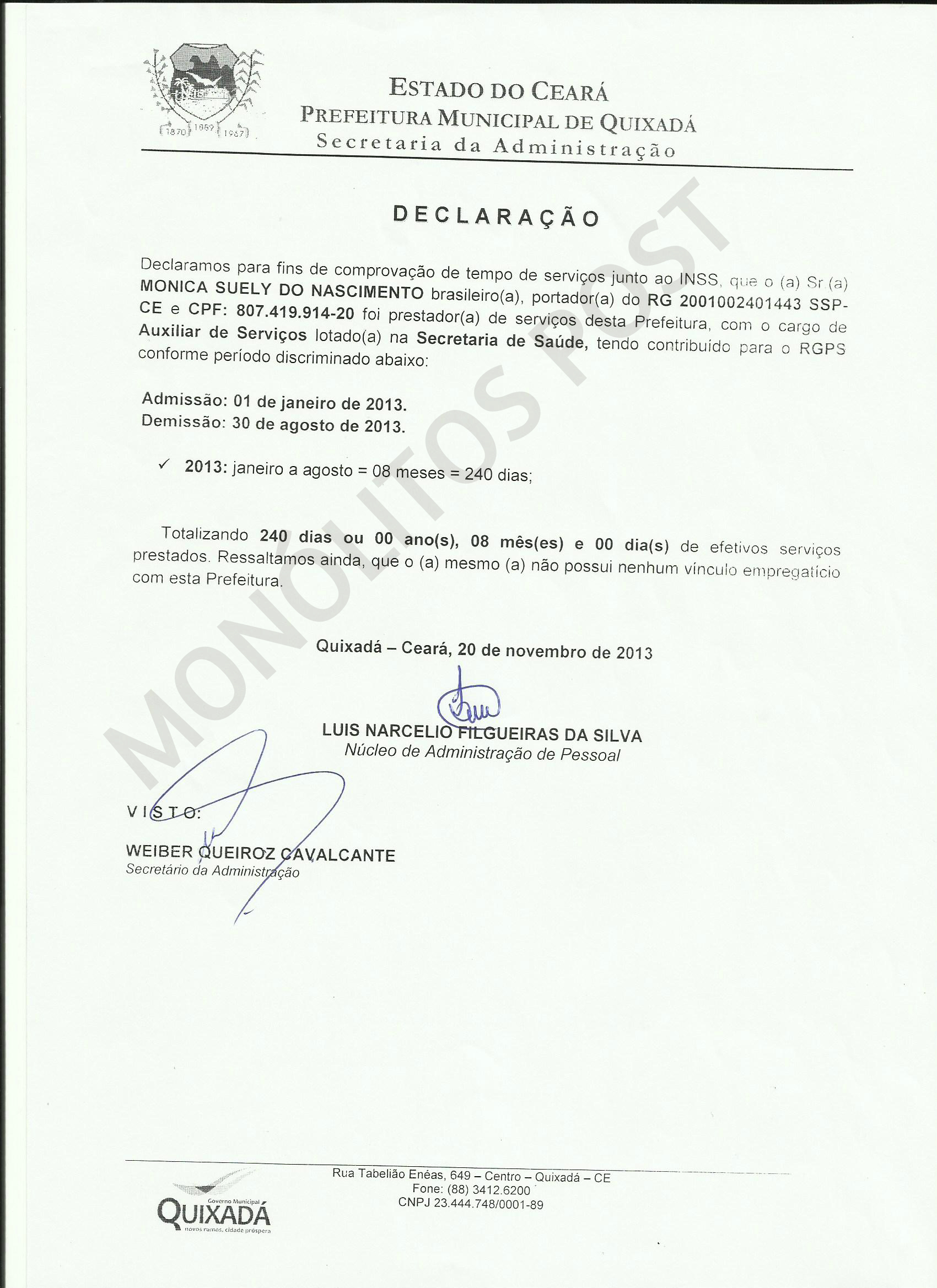 Em declaração assinada no último dia 20, o Secretário de Administração da Prefeitura de Quixadá, Weiber Queiroz Cavalcante, reconhece que Mônica Suely do Nascimento realmente prestou serviços ao município. (Veja cópia desta declaração no final da matéria.)