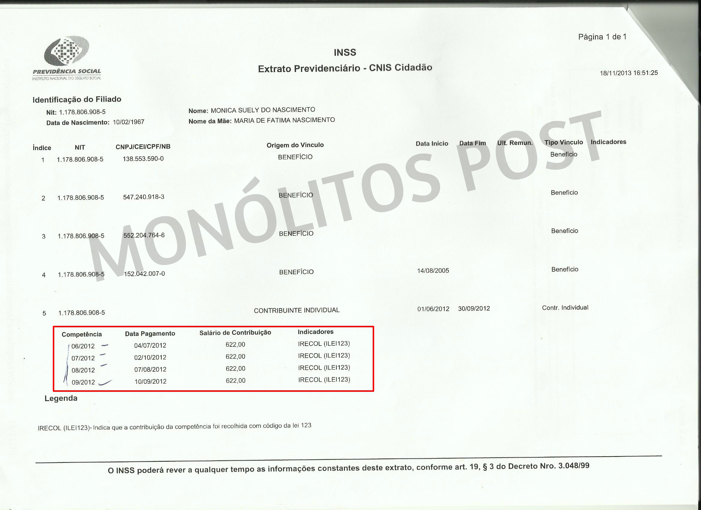 Cópia do Extrato Previdenciário da prestadora, com últimos pagamentos ainda do ano de 2012: