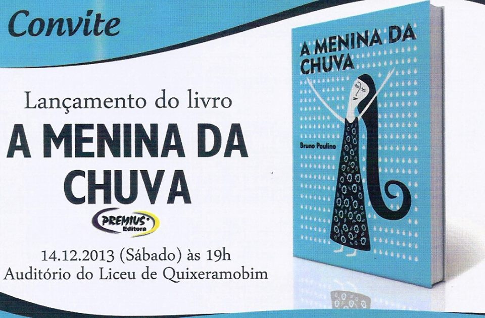 No próximo sábado, dia 14, às 19 horas, no auditório do Liceu de Quixeramobim, Bruno Paulino lançará mais um livro, intitulado “A menina da chuva”. De acordo com o produtor cultural Silas Falcão, “A menina da chuva nos convence que odiar é sempre uma inutilidade.”